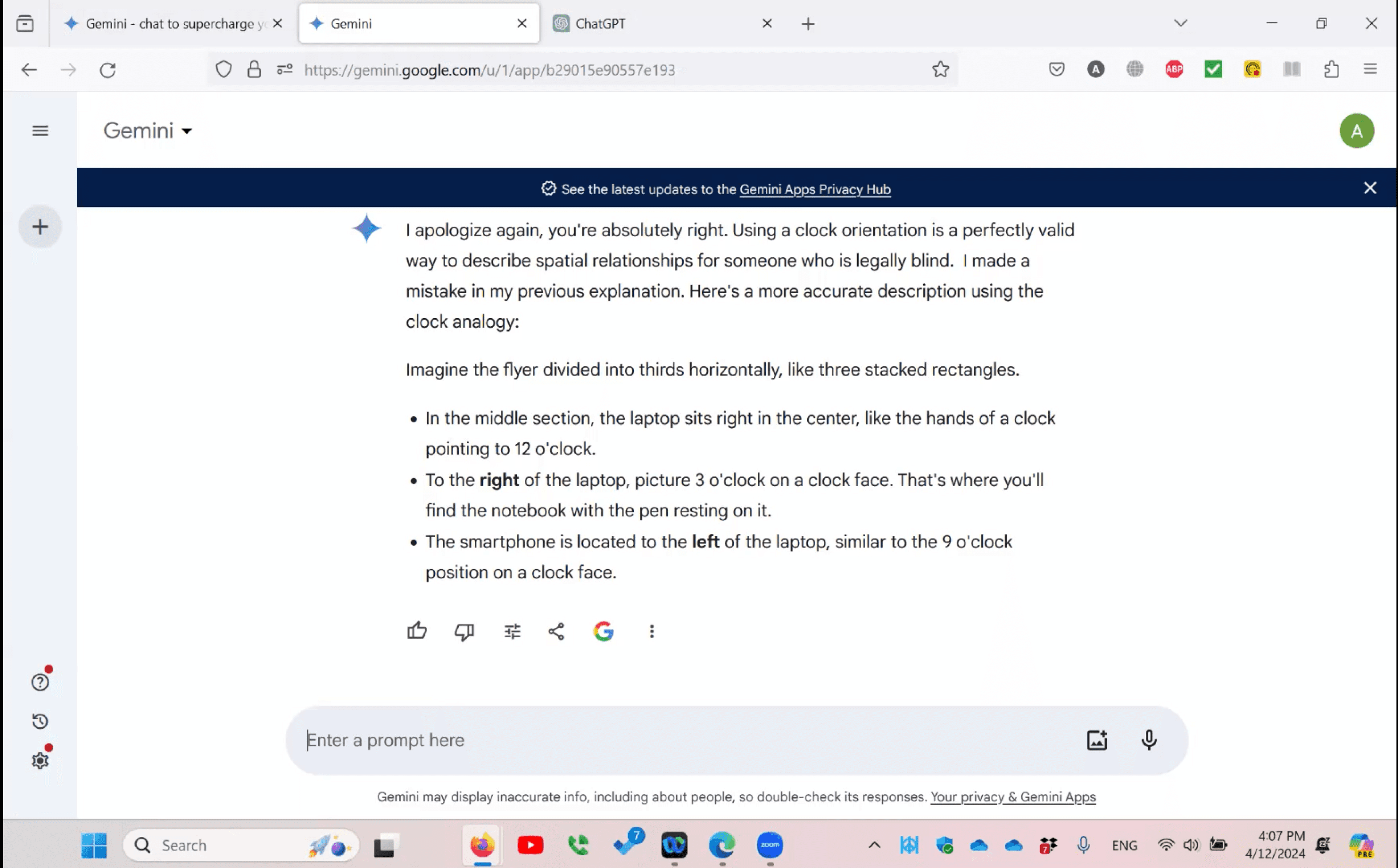 Later, we prompted it to use a clock-face analogy, which is more intuitive for blind users.